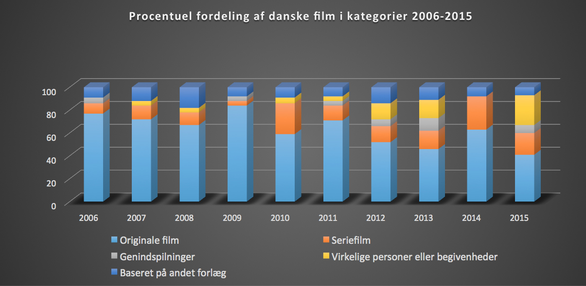 Og sådan er den generelle tendens for de danske premierefilm. 2015 byder blot på elleve danske spillefilm baseret på originale historier ud af et samlet udbud på 27. Det svarer til en andel på kun 41 procent.