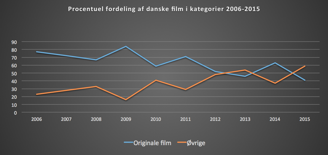 Sidste år var 64 procent af de danske spillefilm baseret på originale historier, mens det tilbage i 2009 var hele 84 procent, hvilket da også var et udsædvanligt godt år, hvad angår antallet af originale historier.