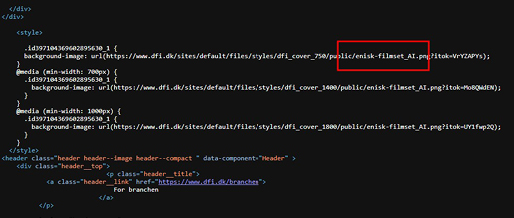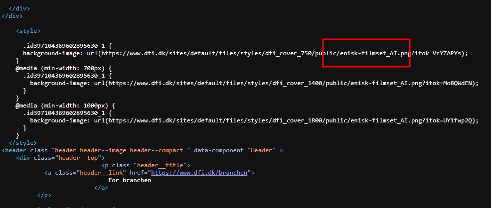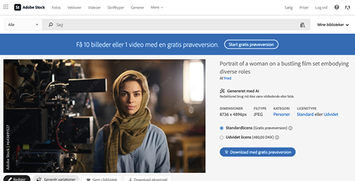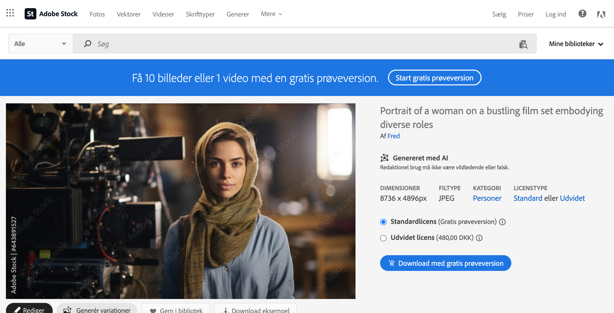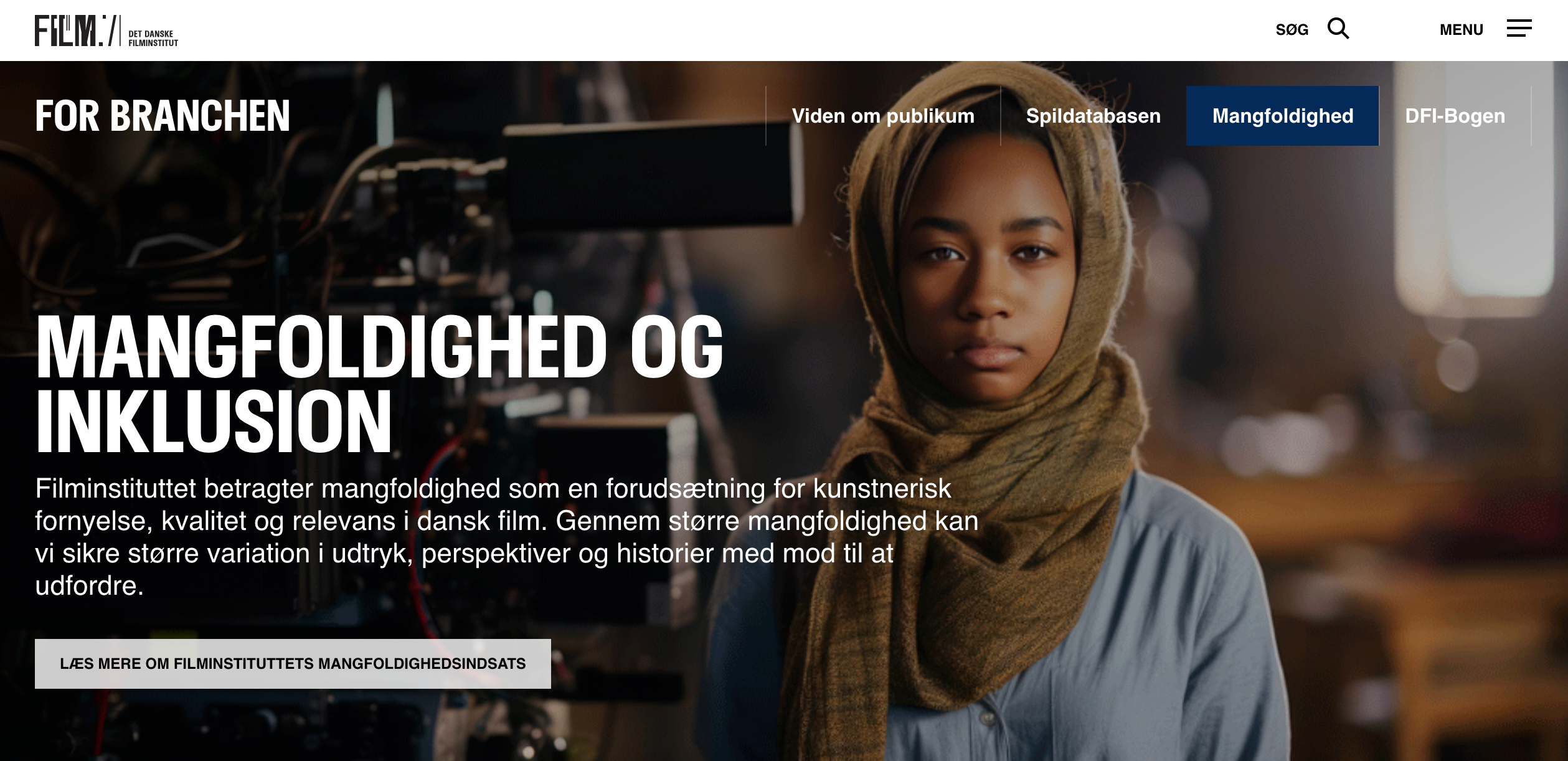 På Det Danske Filminstituts hjemmeside under ”Mangfoldighed” har man valgt at bruge et AI-genereret arkivbillede fra Adobe af en kvinde i tørklæde, hvis lyse hudfarve er blevet digitalt ændret til at fremstå som mørkere.