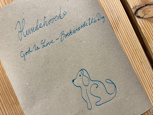 På et andet kan man se det stykke genbrugspapir, hvor Annika Berg med blå skrift har skrevet titlen på filmen samt undertitlen God Is Love – Backwards It’s Dog, der understreger temaet om hunde som guddommelige væsner. Herunder ses en nydelig stregtegning af en hund set fra siden.