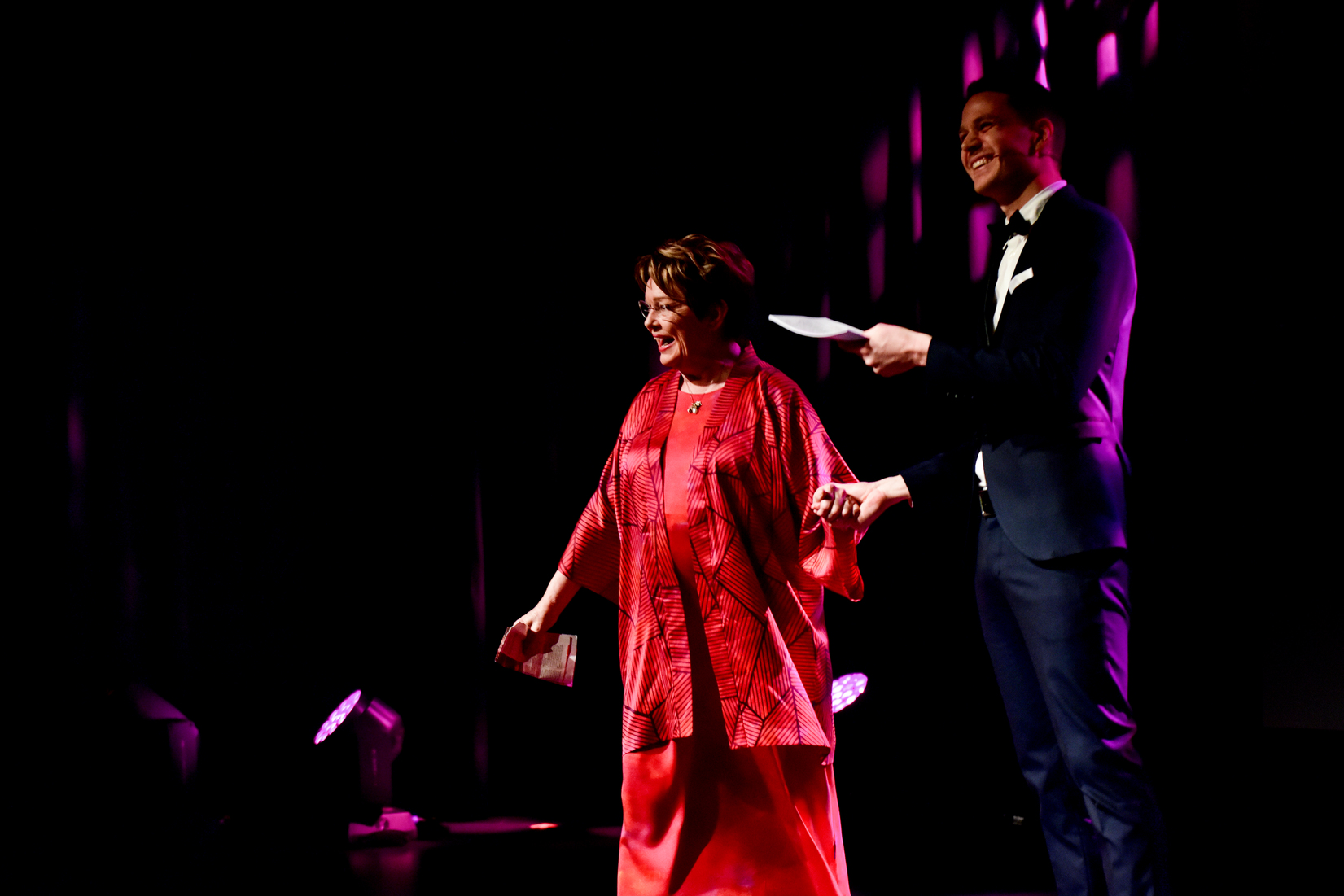 Ghita Nørby var ulasteligt klædt i en pompøs, rød kjole, da hun med Jesper Zuschlag i hånden gik på scenen for at uddele prisen for bedste scenografi.