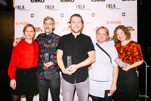 Tre priser vandt også folkene fra Weltschmerz, hvis Valdemar Cold Winge Leisner (yderst tv.) tog prisen for bedste fotografering. Instruktør Jesper Dalgaard (nummer to fra højre) og komponist Søren Stenager (yderst th.) modtog henholdsvis statuetter for bedste dokumentar og originale musik.
