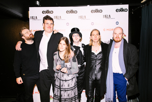 Aftenens store vinder af hovedprisen blev holdet bag Forever Now, der som nummer to fra venstre tæller tonemester Christian Munk Scheuer, instruktør Kristian Håskjold, producer Siri Bøge Dynesen og skuespiller Frederikke Dahl Hansen. Længst til venstre står Håskjolds kæreste Eva Kristine Lendorph Christensen, der er scenograf.