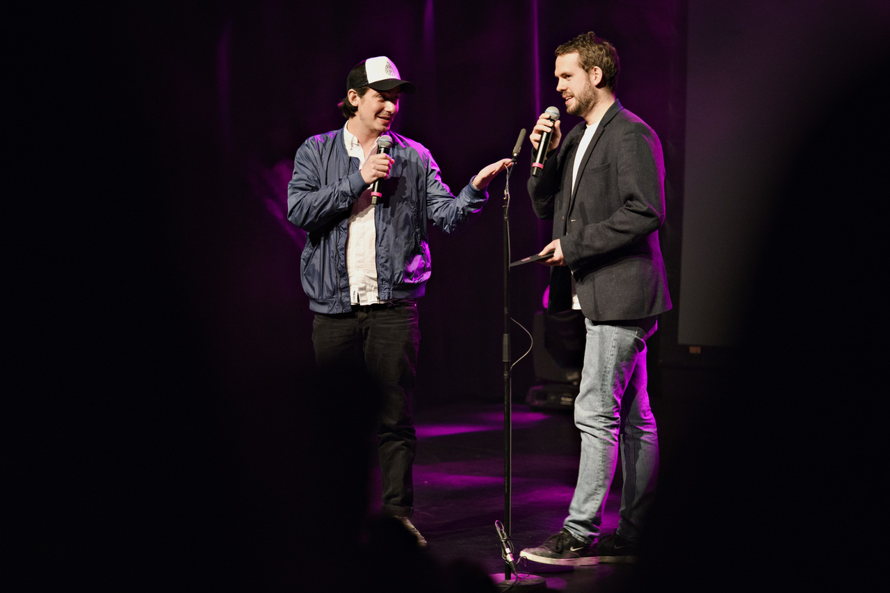 Den velklædte komponist Lasse Aagaard vinder for sin originale musik i Esther Wellejus’ dokumentar Vi lader billedet stå et øjeblik. Han tager her en snak med jurymedlem og animationsinstruktør Tor Fruergaard.