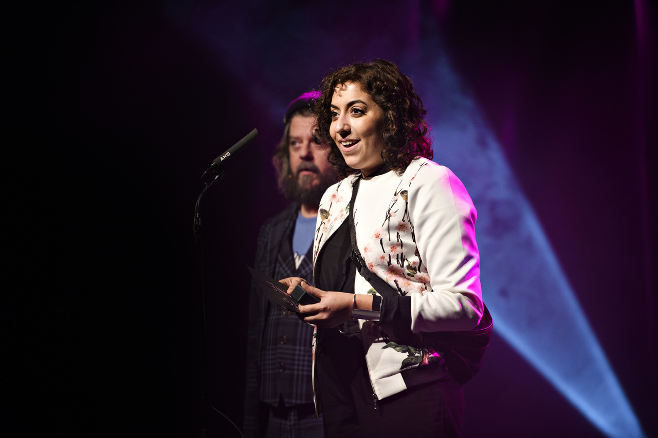 Prisfesten er sponsoreret af C More og støttet af Det Danske Filminstitut, så Jens Arnesen fra streamingtjenesten og Louise Haugstrup Jensen fra Filminstituttet går på scenen for at overrække Publikum Prisen.