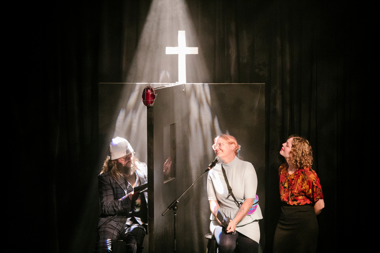 Det særlige ved årets prisfest er, at alle vinderne kommer en tur i skriftestolen, hvor de skal bekende deres synder for Anders Lund Madsen. Her er det vinderne af scenografi-prisen, Kirstine Auener og Amalie Skovhus Petersen, der har skabt et uforglemmeligt univers i Om en måned.