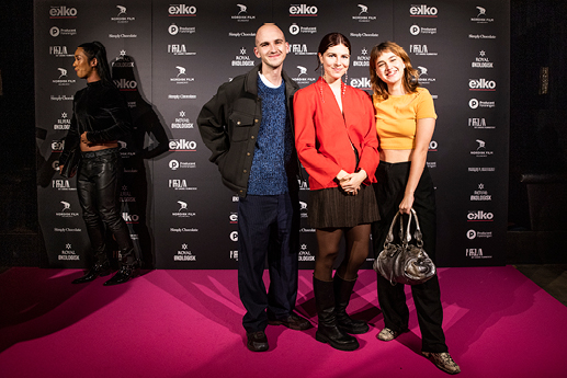 Instruktør Kasper Møller Rask virker afslappet i Tom & Jerry-sweater, selv om hans kortfilm November er nomineret til bedste fiktion, fotografering og klipning. Med sig har han Christina Bach (midt) og filmens producer Iben Søtang.