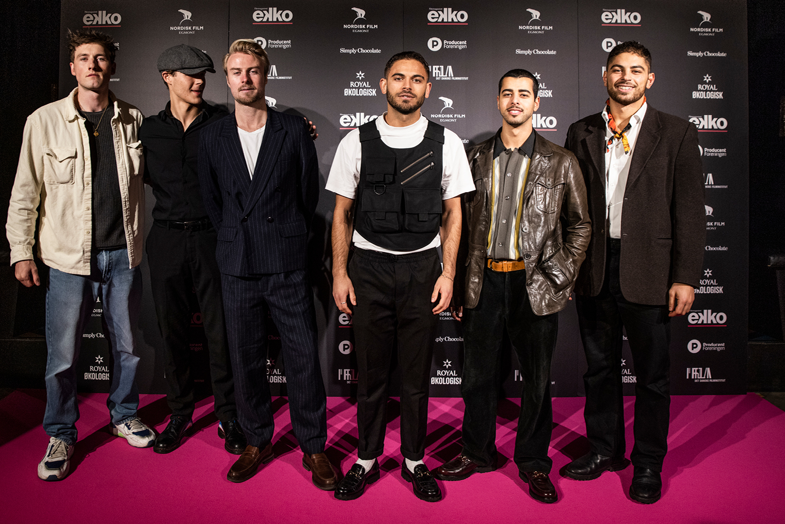 Det store hold bag Amourteur ligner vindere allerede ved ankomsten, og de skulle da også vise sig at hjemtage tre priser fra festen. Fra venstre er det skuespilvinder Marta Holm, Emma Lagrelius, Alvin Olid Bursøe, Stine Primdahl, manuskriptvindere Mads Lind Knudsen og Sylvia Le Fanu (med fotografvinderen Jan Bastian Muñoz Marthinsen i skjul bag sig), Stefanie Munch, Camilla Silvana Navarro Howalt og Jeppe Wowk.