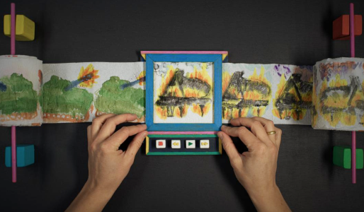 Her sætter hun små toiletruller op i en spole, som var de filmruller, og lader dem passere over skærmen, så det danner en lille, simpel tegnefilm.