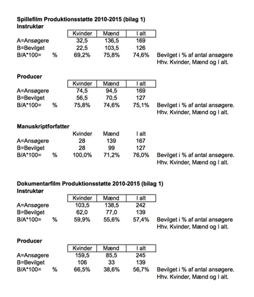 Ud af de 32,5 kvindelige instruktører, som har søgt om produktionsstøtte til spillefilm fra 2010 til 2015, har 22,5 kvindelige instruktører modtaget støtte. Det svarer til, at 69,2 procent af alle de kvindelige instruktører, som har søgt om produktionsstøtte, har modtaget støtte.