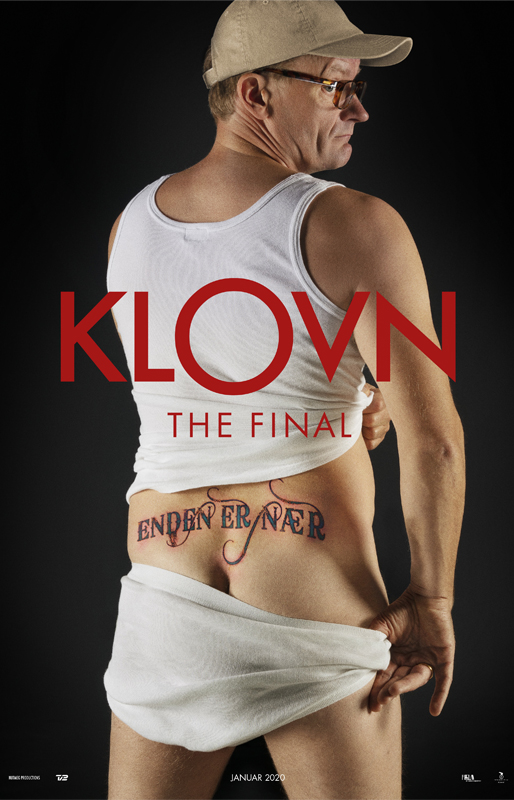 I det lys er plakaten til tredje og sidste film i Klovn-universet vel nærmest bornert. Denne gang har Frank Hvam fået tatoveret ordene ”Enden er nær” på det, man kan kalde den nederste del af ryggen – se billedet herunder!