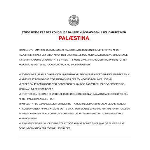 En gruppe elever, lærere og ansatte på Den Danske Filmskole bakker nu op om en støtteerklæring til Palæstina, som studerende på Det Kongelige Danske Kunstakademi står bag.