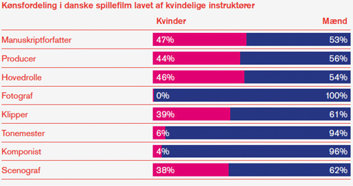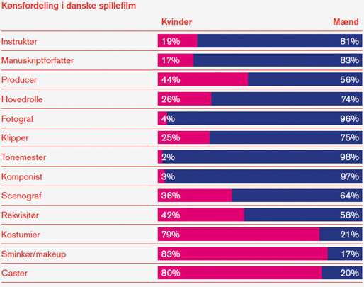 Af de 125 spillefilm, som har fået produktionsstøtte af Filminstituttet fra 2010 til 2015, var kun nitten procent instrueret af en kvinde, mens sytten procent var skrevet af en kvindelig manuskriptforfatter.