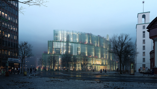 Denne skitse bliver på pressemødet kaldt en mellemløsning. Her er kun stueetagen bevaret, øverste etage er taget af, og tårnet, man kan se til højre i billedet, rykkes ud mod Axeltorv som et kunstværk i gadebilledet.