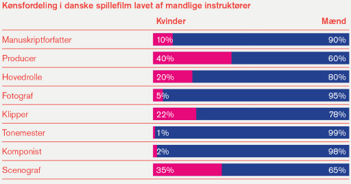 Af de mest fremtrædende roller på et filmhold er kun producerposten nogenlunde ligeligt fordelt med 56 % mænd og 44 % kvinder.