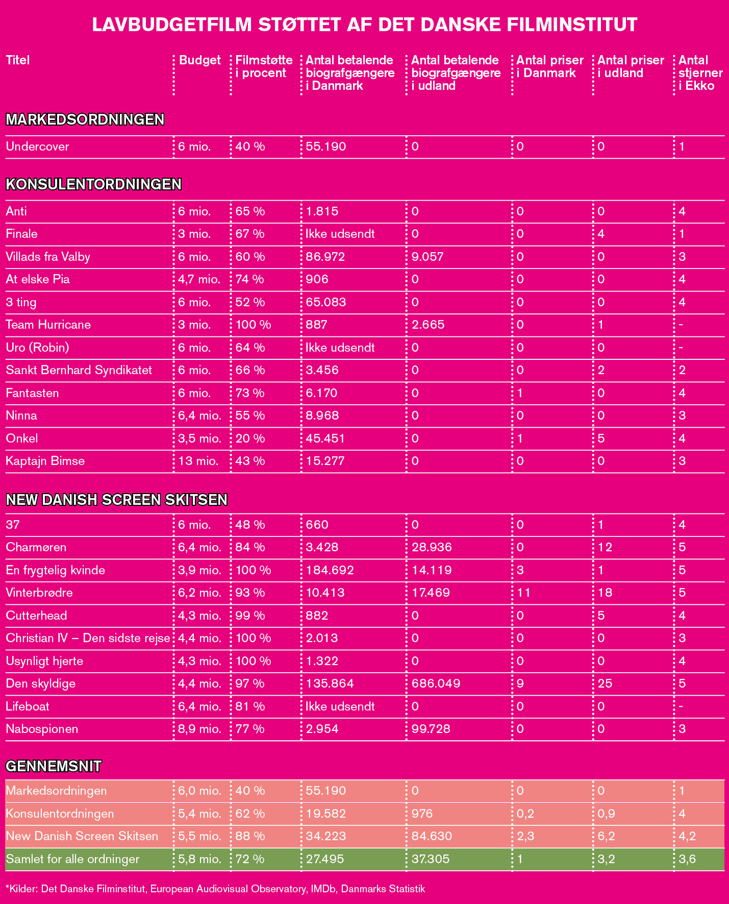 Undersøgelsen viser tydeligt, at lavbudgetfilmene har det bedst på New Danish Screen, som har specialiseret sig i at hjælpe unge talenter gennem en grundig sparring.
