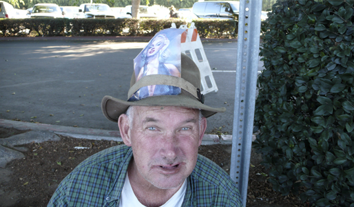 En hjemløs mand i Los Angeles har prydet sin hat med et billede af symbolet på glamour: Marilyn Monroe.