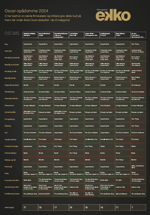 Ekkos egen Oscar-ekspert Casper Hindse vandt som så ofte før gættelegen og kan vel efterhånden godt kalde sig Danmarks førende Oscar-ekspert blandt kritikerne.