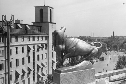 Ursus med tyren set mod Københavns gamle forlystelseskvarter med Cirkusbygningen og Tivoli i baggrunden. Foto: Det Kongelige Bibliotek.