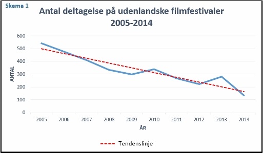 Danske spillefilm (fiktion), der havde biografpremiere i 2005, blev vist i konkurrence ved 543 filmfestivaler. Spillefilm, der havde biografpremiere i 2014, er kun blevet vist på 133 festivaler.