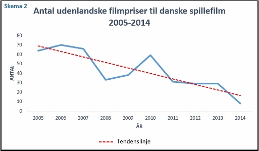Faldet er endnu større, hvis vi ser på, hvor mange danske spillefilm der i samme periode er strøget til tops og har vundet en pris på en festival (skema 2).