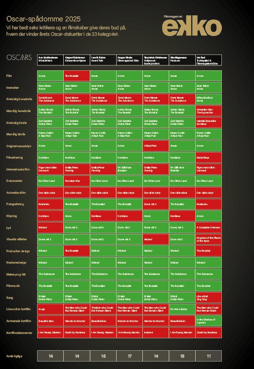 Når det gælder de store priser, er Oscar-panelet forholdsvis enige. Alle så Sean Bakers pris for bedste instruktør med Anora komme, og kun Casper Christensen gættede forkert på The Brutalist som bedste film.