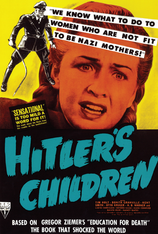Propaganda-dramaet Hitler’s Children (1943) stiller nazi-regimets ondskabsfulde tyranni til skue. Ifølge plakaten kan ordet ”sensation” ikke retfærdiggøre filmens indhold.