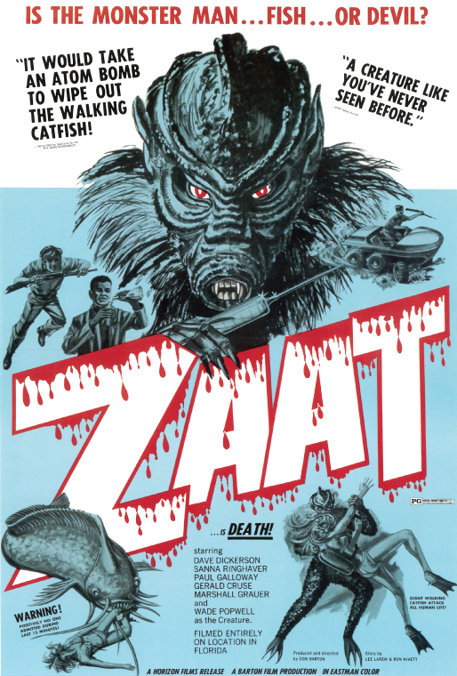 I Florida-gyseren Zaat (1971) bliver en gal videnskabsmand til et monster, da han injicerer stoffet Zaat. Det har længe været en stående joke blandt kollegaerne, men nu er hævnens time inde. ”Is the monster man … fish … or devil?”