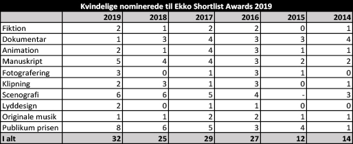 For to år siden var der rekordhøje 29 nomineringer til de unge filmkvinder, men i år er det tal blevet slået. Hele 32 nomineringer ved Ekko Shortlist Awards 2019 er gået til kvinder!