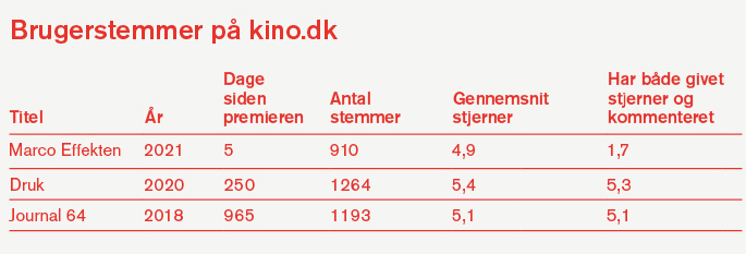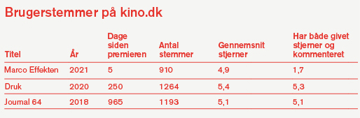 Både den forrige film i Afdeling Q-serien, Journal 64, og Thomas Vinterbergs biografsucces Druk har på kino.dk fået omkring 1200 brugerstemmer.
