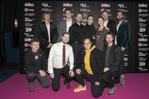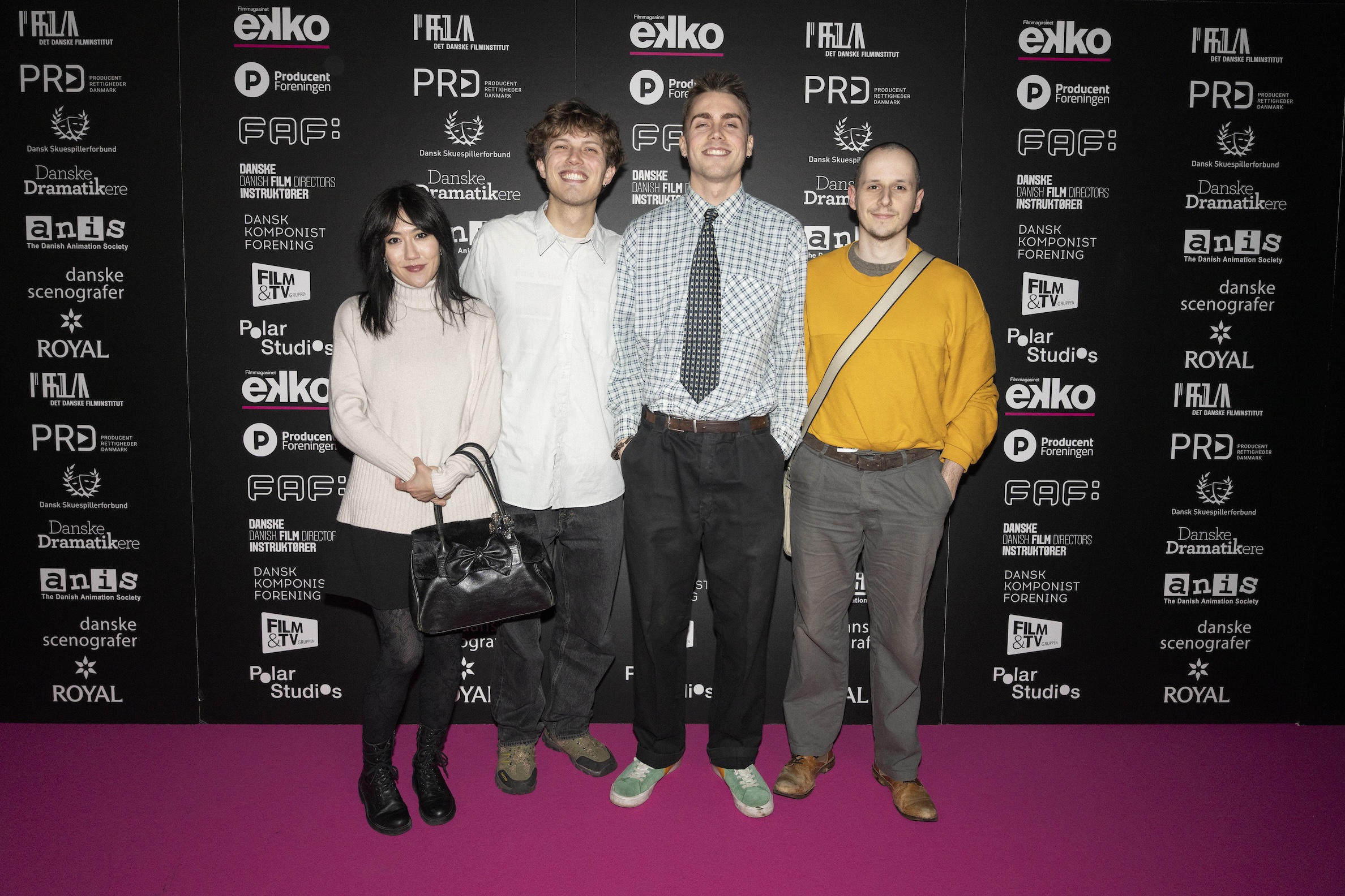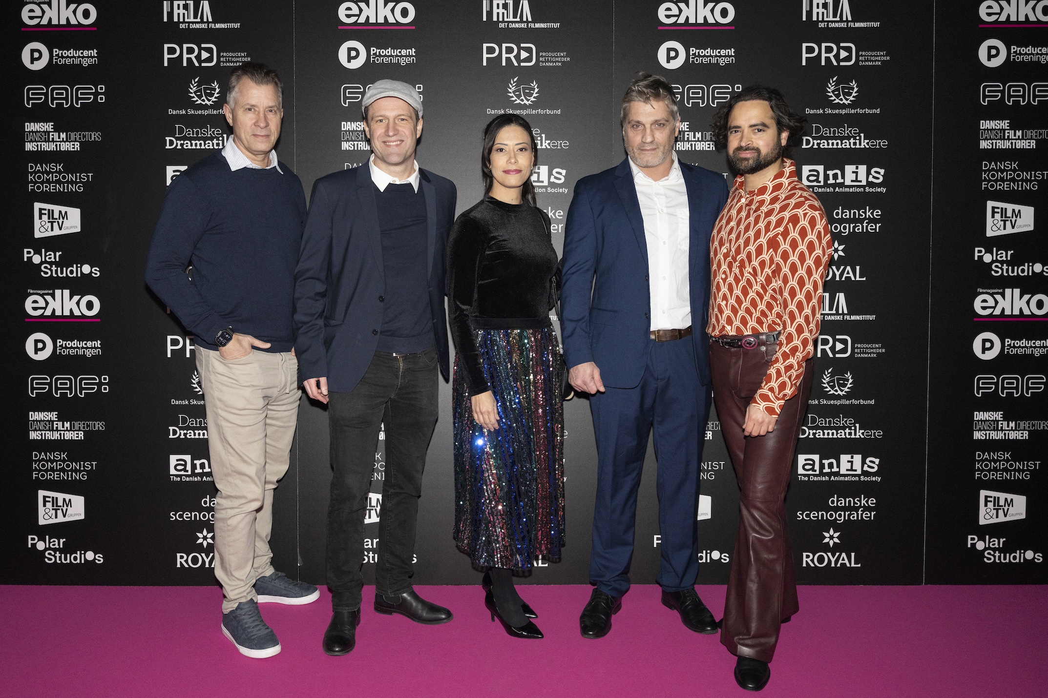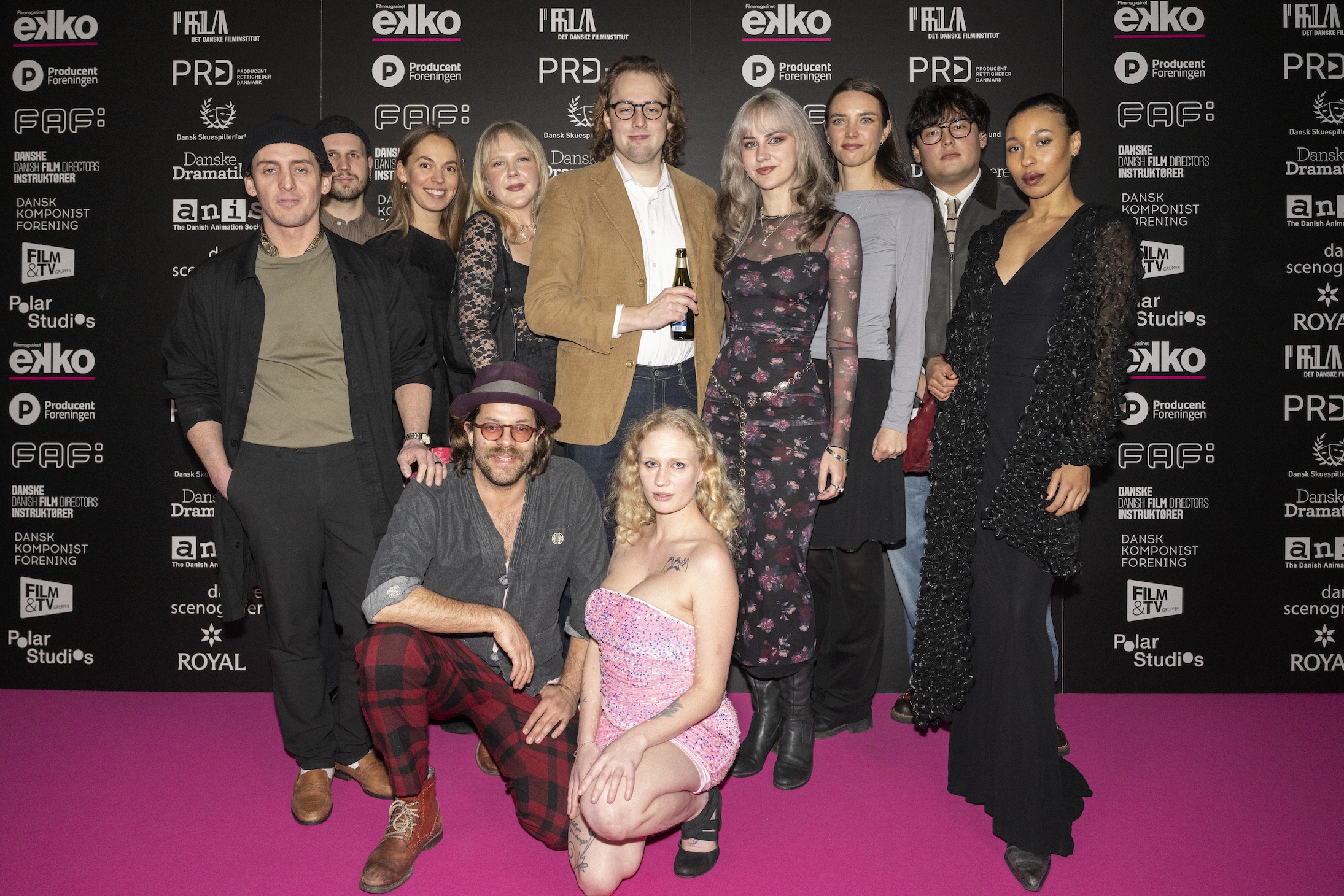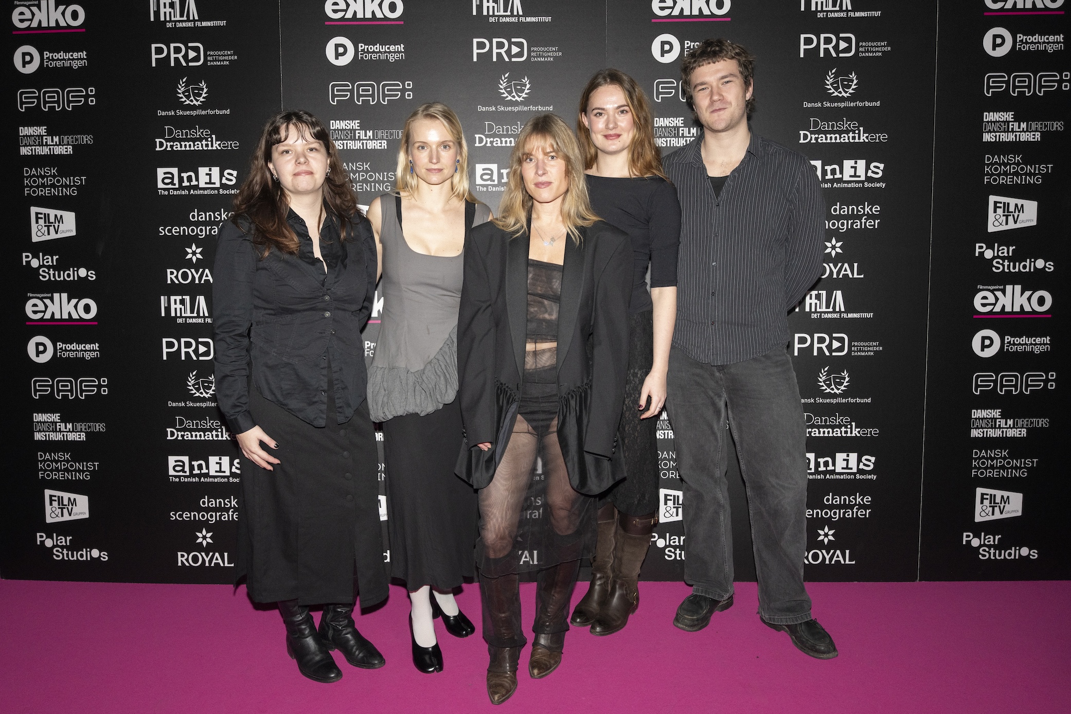 Den originale og vilde An Animal Being var nomineret til tre priser. Instruktør Mone Frogg (i midten), manuskriptforfatter Stine Likodelle (nummer to fra venstre) og producer Mikkel Smidt (nummer fire fra venstre) var nomineret for bedste fiktion. Atli Arnarsson (yderst til venstre) var nomineret for bedste lyddesign og Lukas Daugbjerg (yderst til højre) for fotografering.