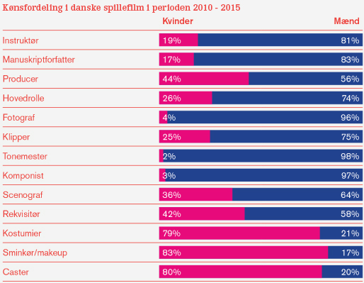 Statistikken bygger på en kategorisering af mænd og kvinder i ledende stillinger på danske filmproduktioner, der har fået produktionsstøtte af Det Danske Filminstitut i perioden 2010-2015.