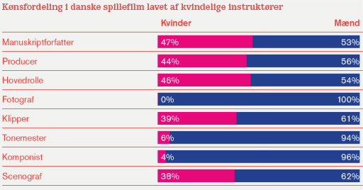 Men af de 41 film, som filminstituttet har støttet i perioden 2013-2015, er hele 44 procent instrueret af kvinder. Og lignende tal ses hos både manuskriptforfattere og producere.