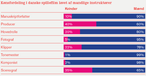 I Danmark er kønsfordelingen helt anderledes, viser Ekkos egen undersøgelse, der kan ses nederst på siden. Blandt de film, som har fået støtte af Det Danske Filminstitut og haft biografpremiere i perioden 2010-2015, udgør de kvindelige instruktører en andel på kun nitten procent. Andelen af kvindelige manuskriptforfattere er helt nede på sytten procent. Noget bedre ser det ud for producere, hvor kvinderne tegner sig for 44 procent.