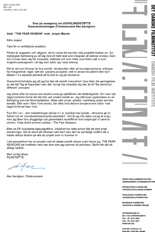 Men Åke havde desværre brugt alle lavbudgetpengene, havde heller ikke en idé om, hvad en antologi er, og ignorerede helt og aldeles de muligheder, en tysk co-produktions-aftale ville have med hensyn til distribution. Så det blev et forkølet afslag (se i bunden af artiklen) på grund af de forsvundne lavbudgetpenge, skrevet på svensk og en opfordring fra pop-up-vicedirektør Claus Ladegaard om, at vi havde en sidste chance – hos Mikkel Munch-Fals. Og sandsynligheden for støtte ville være stor, fik vi at vide.
