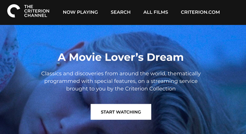 På Criterion Channel er et kæmpe udvalg af gamle klassikere og nye opdagelser og herlig kuratering med for eksempel samlinger af film fra instruktører som Peter Greenaway, Nicolas Roeg, John Schlesinger, Agnès Varda, Stanley Kubrick, Herschell Gordon Lewis og mange flere – altid med en dokumentarfilm og interview-film med instruktørerne.