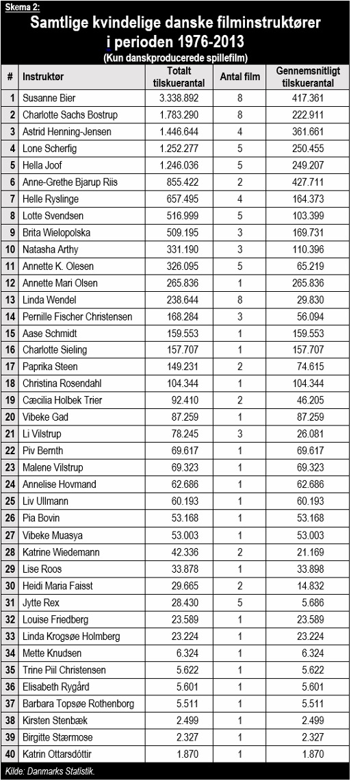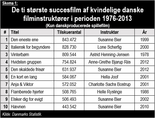 I skema 1, kvindelige danske filminstruktørers mest succesfulde film i perioden 1976-2013. Det er værd af bemærke, at Susanne Bier har hele fire film på top 10-listen. Instruktøren besætter endda også både ellevte og tolvte pladsen.