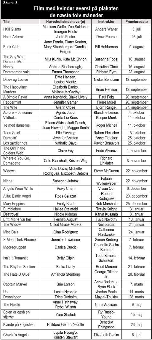 I de næste tolv måneder har syv spillefilm af kvindelige danske instruktører fået en premieredato (skema 1). Men flere danske film af kvindelige filminstruktører afventer fortsat deres officielle premieredato, blandt andre Isabella Eklöfs Holiday og Josefine Kirkeskovs Lifeboat.