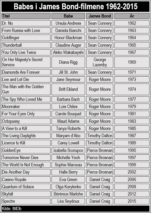 Nederst i dette blog indlæg er en optegnelse over babes i samtlige James Bond-film.