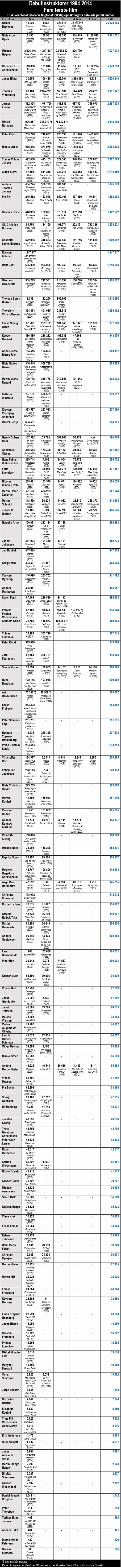 Alle instruktørers præstationer nedenstående er baseret på de første fem spillefilm i biograferne efter debutfilmen i perioden 1995-2014. Kun instruktører med en debutfilm i perioden er medtaget. Derfor figurerer eksempelvis hverken Linda Wendel, Lars von Trier, Bille August, Lone Scherfig eller Erik Clausen i nedenstående skema.