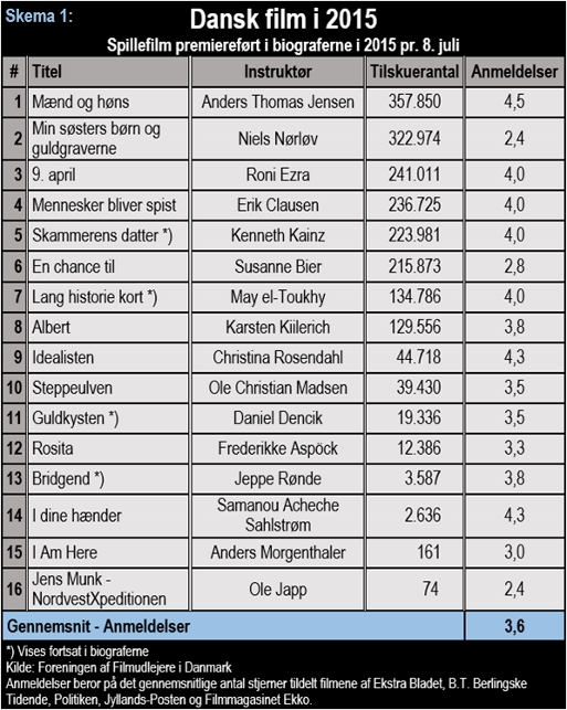 I skema 1 kan de foreløbige tilskuerantal på de individuelle film i 2015 ses. Til det samlende tilskuerantal på spillefilm, som har haft premiere i 2015, skal tillægges tilskuerantallet på dokumentarfilm og antallet af tilskuere i 2015 på film, som havde premiere i 2014. For eksempel er de 307.207 billetter, Hella Joofs All Inclusive fra 2014, solgte i 2015 medtaget. Så kommer vi op på de 2,4 millioner solgte billetter.