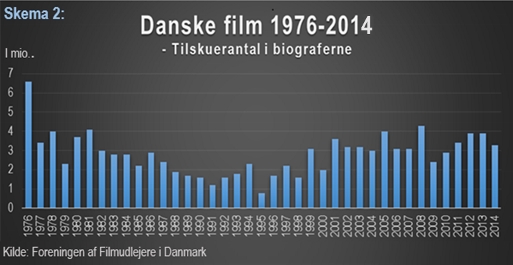 I skema 2 ses tilskuerantallet til danske film i perioden 1976-2014.