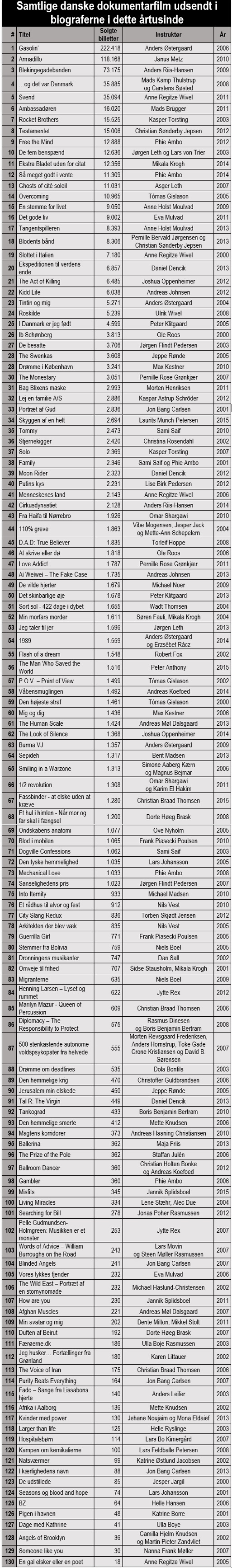 Hele 130 danske dokumentarfilm har i dette årtusinde fundet vej til danske biografers lærred. Det samlede billetantal løber op i 791.811, det er dog kun promiller af biografernes samlede antal solgte billetter i perioden.