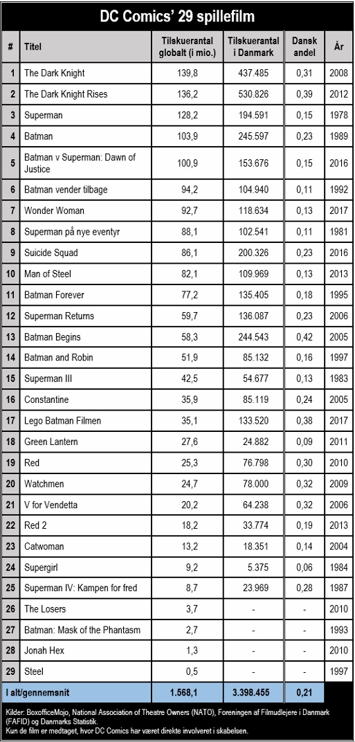 DC Comics, selskabet bag blandt andre Batman, Superman og Wonder Woman, har gennem tiden lokket 1,6 milliarder biografgængere globalt ind i biografens mørke, heraf 3,4 millioner i Danmark. DC Comics film har alene i biografindtægter stået for over 27 milliarder kroner.