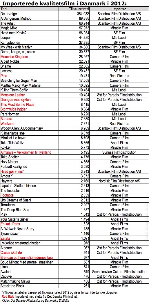 Om end både Det Danske Filminstitut (DFI), Nordisk Film & TV Fond og EU har støtteordninger til import af kvalitetsfilm til Danmark, sker det i overvejende grad på filmimportørens egen regning og risiko – og højner den gennemsnitlige kvalitet i biografernes repertoire betragteligt. Som det kan ses af ovenstående skema sker import af kvalitetsfilm med stærkt skiftende held og nogle af importerne må da også betragtes som ren filantropi. Der er derfor god grund til at hylde disse tapre mænd og kvinder, som holder kvalitetsfilmens fane højt i Danmark.