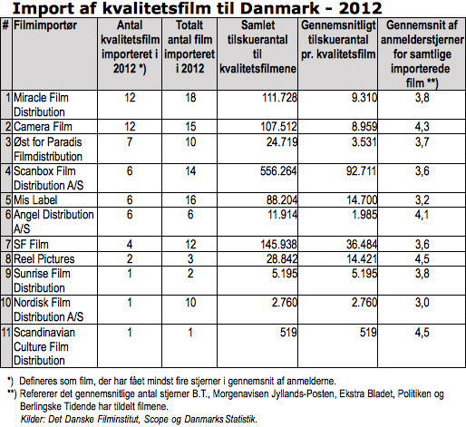Om end både Det Danske Filminstitut (DFI), Nordisk Film & TV Fond og EU har støtteordninger til import af kvalitetsfilm til Danmark, sker det i overvejende grad på filmimportørens egen regning og risiko – og højner den gennemsnitlige kvalitet i biografernes repertoire betragteligt. Som det kan ses af ovenstående skema sker import af kvalitetsfilm med stærkt skiftende held og nogle af importerne må da også betragtes som ren filantropi. Der er derfor god grund til at hylde disse tapre mænd og kvinder, som holder kvalitetsfilmens fane højt i Danmark.