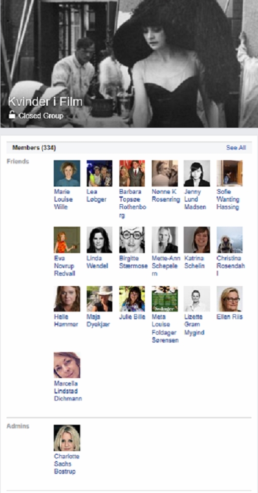 De 334 kvindelige branchemedlemmer af den lukkede gruppe havde dermed på eget initiativ sat mænd uden for døren, når der skulle skabes klarhed og diskussion om det vigtige emne. Blandt medlemmerne findes koryfæer som filminstruktørerne Linda Wendel, Birgitte Stærmose, Mette-Ann Schepelern, Christina Rosendahl og festivalkonsulent Lizette Gram Mygind fra Det Danske Filminstitut. Siden administreres af Charlotte Sachs Bostrup, som ligeledes er filminstruktør.