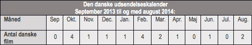 En problematik, som faktisk også kan overføres til dansk film, hvor trenden efterhånden er, at de kun udsendes to gange om året: i efterårs- og vinterferien, i henhold til nedenstående skema: