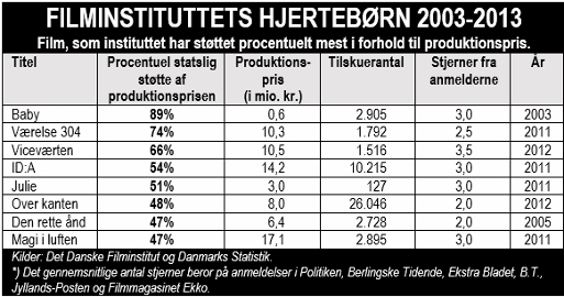 I gennemsnit har Det Danske Filminstitut i årene 2003-2013 støttet danske film med omkring 37 procent af produktionsomkostningen. Med andre ord: Staten har gennemsnitligt betalt cirka en tredjedel af, hvad filmene koster.
