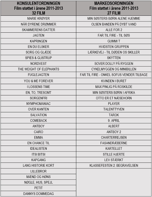 Titlerne på filmene støttet gennem henholdsvis konsulent- og markedsordningen kan ses herunder. Man kan kun undre sig over, hvad kulturparnasset er så ulykkelige over?
